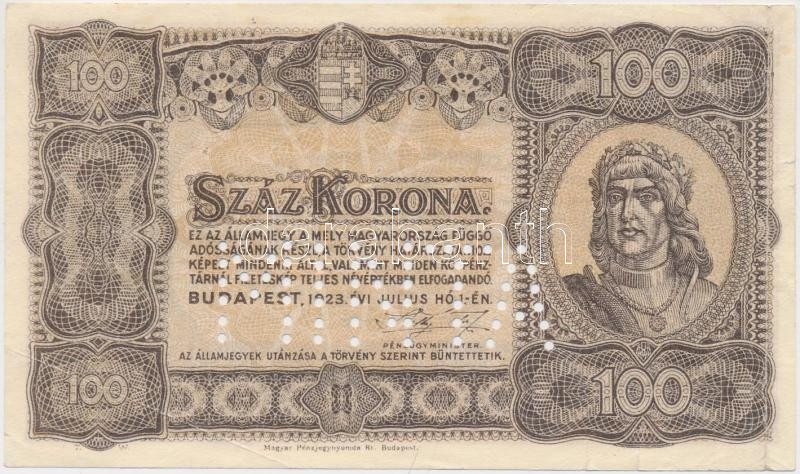 1923. 100K hamis "MINTA" perforációval, számozás nélkül, nyo... https://www.darabanth.com/de/207-Fernauktion/207.0/Numismatik/Ungarische-Banknoten~200009/1923-100K-hamis-MINTA-perforacioval-szamozas-nelkul-nyomdahely-jelolessel-TIII-3Cbr3E~II836640