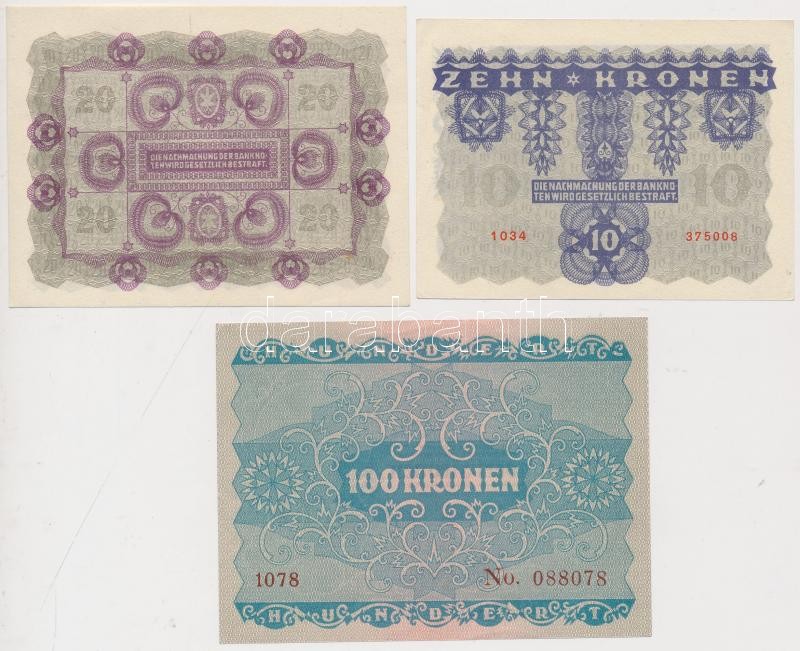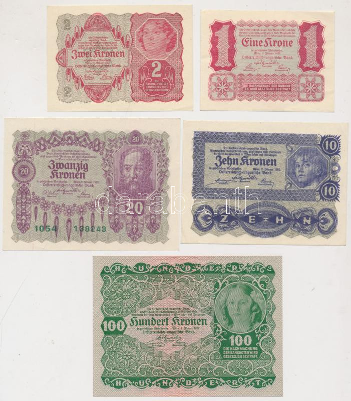Osztrák-Magyar Bank 1922. 1K + 2K + 10K + 20K + 100K T:I-II- https://www.darabanth.com/de/207-Fernauktion/207.0/Numismatik/Ungarische-Banknoten~200009/Osztrak-Magyar-Bank-1922-1K-plus-2K-plus-10K-plus-20K-plus-100K-TI-II-~II838656