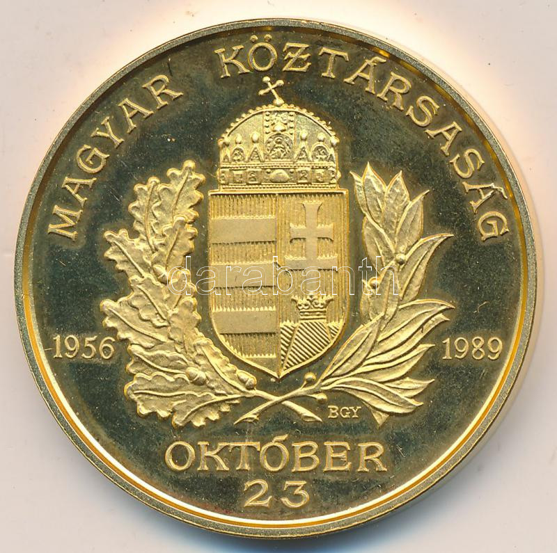 Bognár György (1944-) 1989. "1956-1989 Magyar Köztársaság" aranyozott ... https://www.darabanth.com/de/207-Fernauktion/207.0/Numismatik/Ungarische-Edelmetall-Gedenkmunzen~200011/Bognar-Gyorgy-1944-1989-1956-1989-Magyar-Koztarsasag-aranyozott-emlekerem-disztokban-~II844715