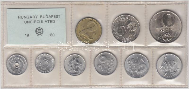 1980. 2f-10Ft 9db klf érmés forgalmi sor fóliatokban T:1 https://www.darabanth.com/de/207-Fernauktion/207.0/Numismatik/Ungarische-Munzen~200010/1980-2f-10Ft-9db-klf-ermes-forgalmi-sor-foliatokban-T1~II807682