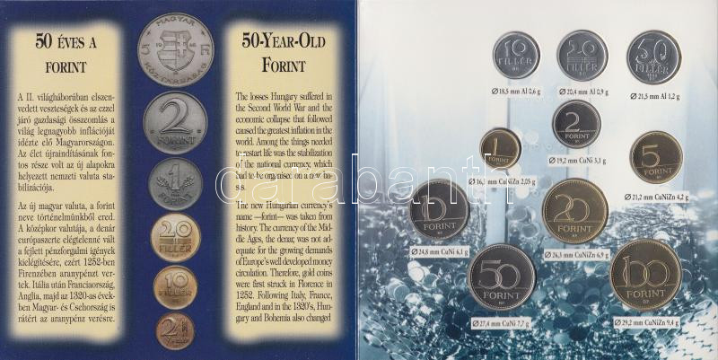 1996. 10f-100Ft "50 éves a forint" 10klf darabos forgalmi so... https://www.darabanth.com/de/207-Fernauktion/207.0/Numismatik/Ungarische-Munzen~200010/1996-10f-100Ft-50-eves-a-forint-10klf-darabos-forgalmi-sor-disztokban-TPP~II764860