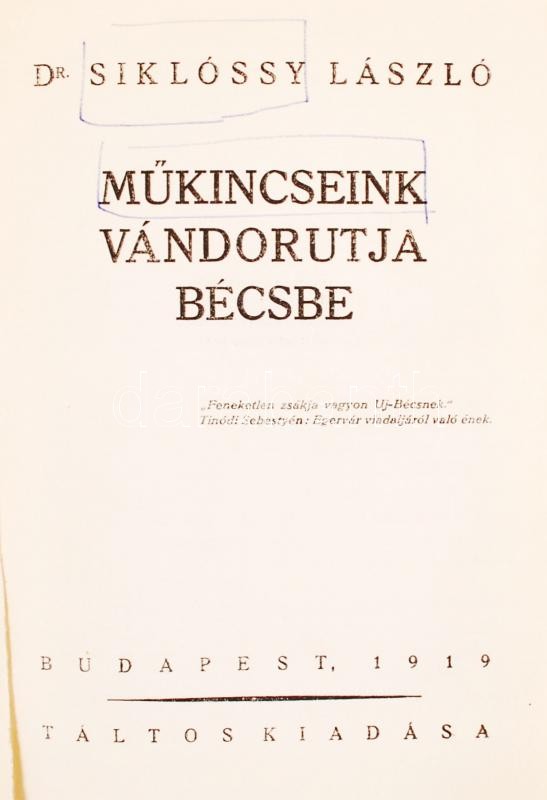 Dr. Siklóssy László: Műkincseink vándorútja Bécsbe. Bp., 1919, Táltos ... https://www.darabanth.com/de/208-Fernauktion/208.0/Andere-Sammelgebiete/Bucher-Architektur-Kunst~30013/Dr-Siklossy-Laszlo-Mukincseink-vandorutja-Becsbe-Bp-1919-Taltos-Kiadasa-Egeszvaszo~II848036