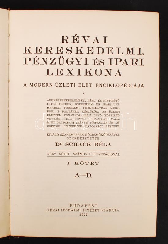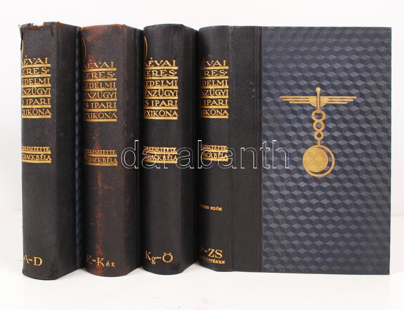 Schack Béla(szerk.): Révai kereskedelmi, pénzügyi és ipari lexikona I-IV. kötet. A modern üzleti élet enciklopédiája. Bp., 1929-1931. Kiadói aranyozott gerincű félbőr kötés, festett lapszélek, jó állapotban.