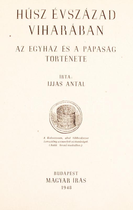 Ijjas Antal: Húsz évszázad viharában, Az egyház és a pápaság története. Bp., 1948, Magyar Írás. Kiadói aranyozott félvászon kötés, kissé piszkos, de egyébként jó állapotban.