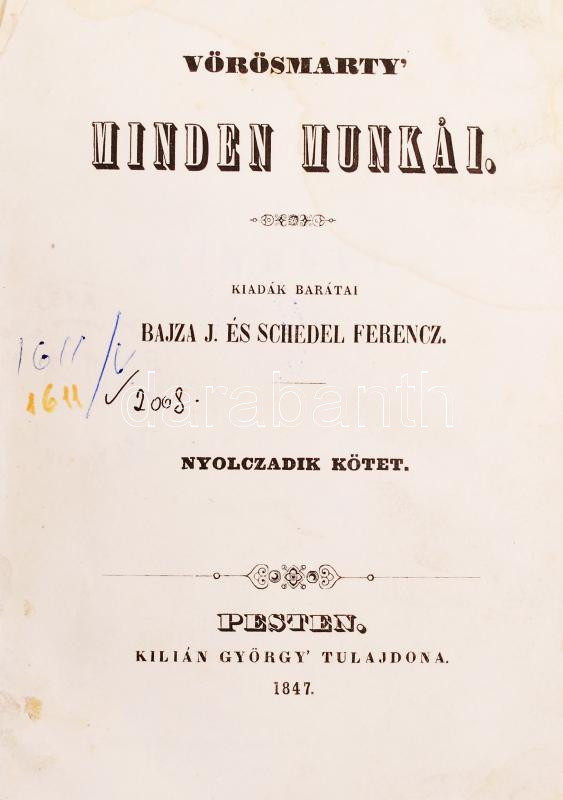 Vörösmarty' minden munkái. Kiadták barátai Bajza J. és Schedel Ferencz. Nyolczadik kötet. Pest, 1847, Kilián György. Félvászon kötés, kopottas állapotban.