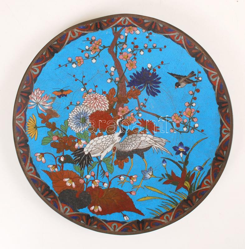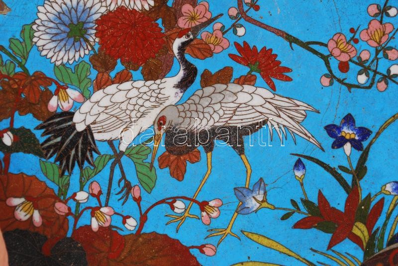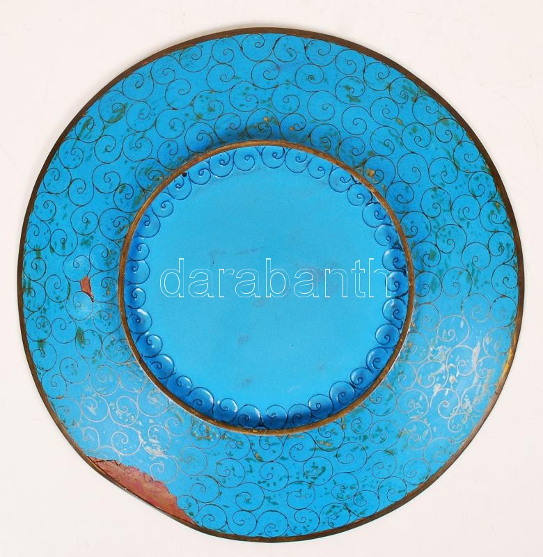 Beschreibung: Antik madaras kínálótál, zománc díszítéssel, sérült, d:30 cm