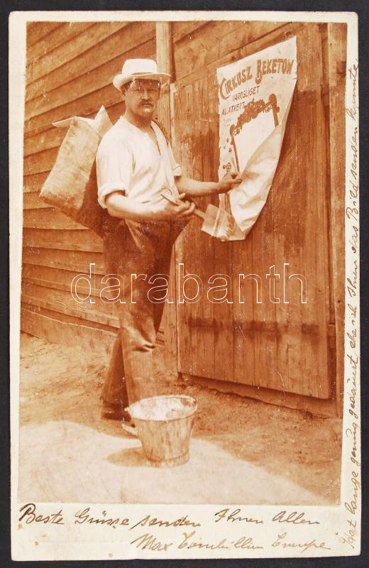 1908 Budapest, Városliget a Beketow cirkusz fellépésére plakátot ragas... https://www.darabanth.com/de/208-Fernauktion/208.0/Andere-Sammelgebiete/Foto~30032/1908-Budapest-Varosliget-a-Beketow-cirkusz-fellepesere-plakatot-ragaszto-artista-Hazi-kesz~II850711