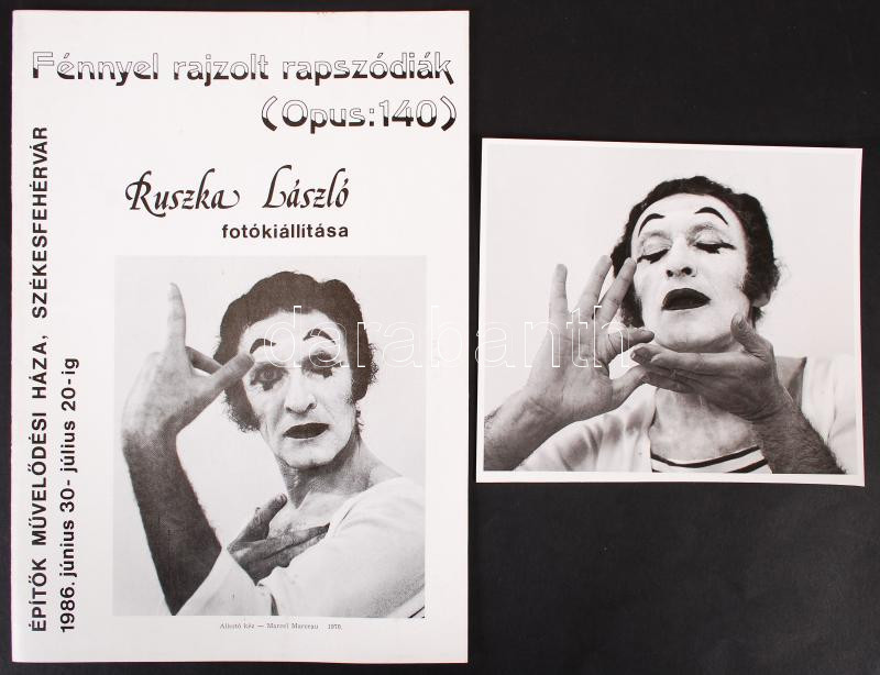 1970 Ruszka László (1936-): Marcel Marceau a Pillangót mímeli, vintage fotó, pecséttel jelzett, feliratozott, hozzáadva a szerző kiállítási katalógusát, 16x18 cm