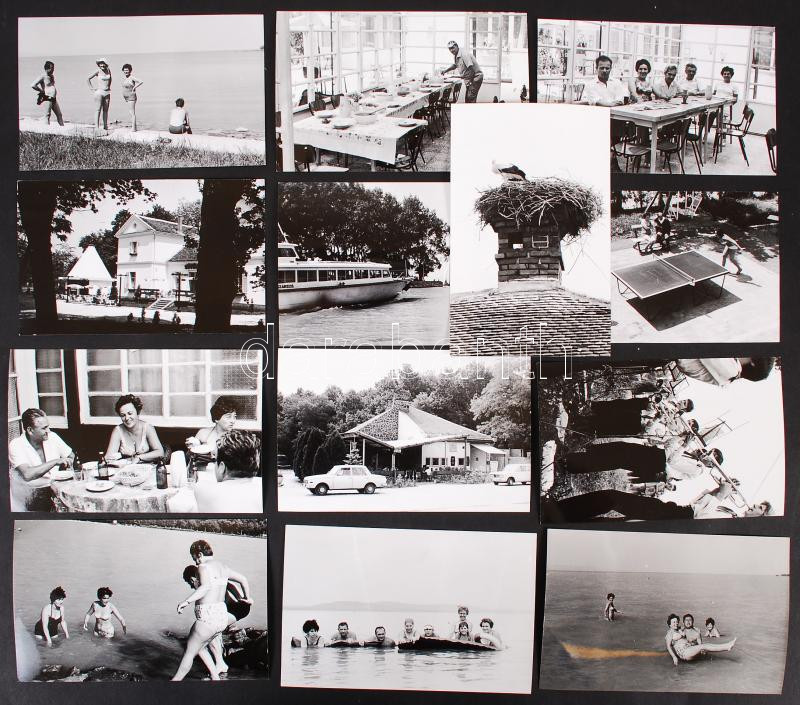 Beschreibung: 1971 Balatonboglár - A METRO dolgozóinak balatonboglári üdüléséről készült képriport, 13 db fotó, 9x14 cm