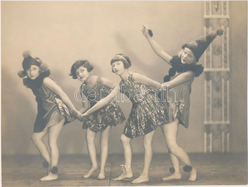 cca 1920-1930 Szentpál Olga mozdulatművész fénykép archívumából feliratozott kép Kovács Margo, Keltscha Babi, Xeutsch Éva, Új Manci fellépéséről, 16x21 cm