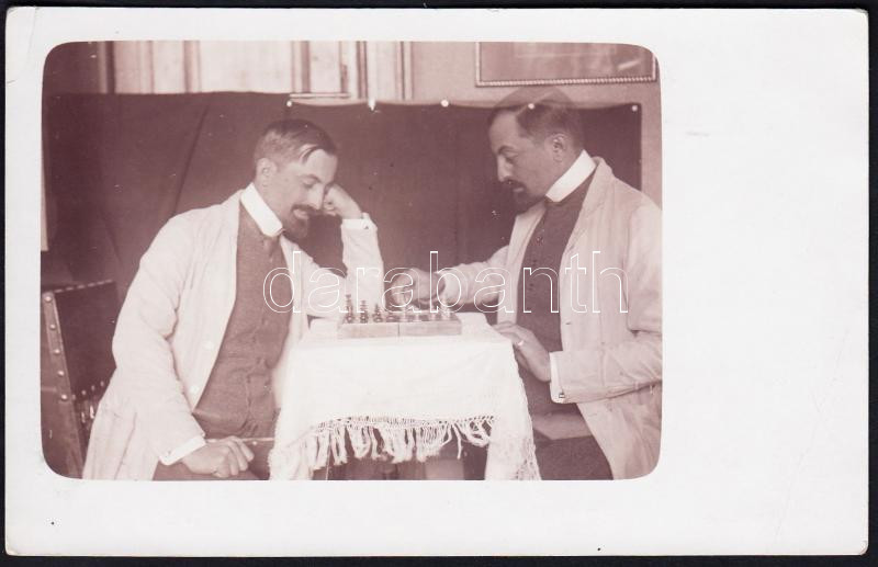 cca 1920 Kerny István (1879-1963): Sakkozó önarckép, vintage trükkfotó (kettős expozíció ugyanarra a negatívra, sötét háttér előtt), pecséttel jelzett, 9x14 cm