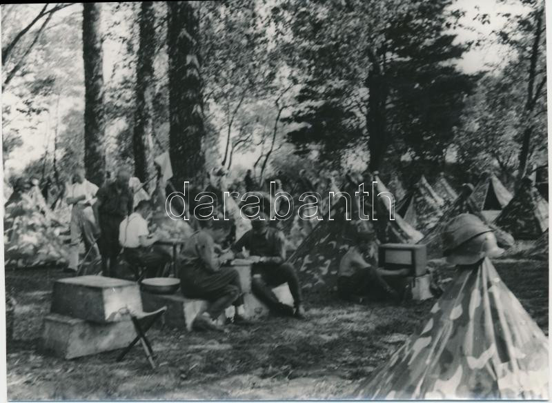 1942 Thöresz Dezső (1902-1963): A magyar rádió szól a fák közé épített táborban. A 2. magyar hadsereg kivonulása a Don-kanyarhoz. A szerző az oda utat fényképezte, kb. 130-150 eredeti negatív őrzi a katonák harctérre vonulását, ez a kép mai másolat a gyűjteményben található eredeti negatívról, 12x17 cm / military photo, camp, listening to the radio
