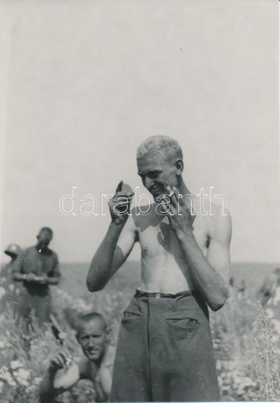 1942 Thöresz Dezső (1902-1963): Borotválkozni kellene. A 2. magyar hadsereg kivonulása a Don-kanyarhoz. A szerző az oda utat fényképezte, kb. 130-150 eredeti negatív őrzi a katonák harctérre vonulását, ez a kép mai másolat a gyűjteményben található eredeti negatívról, 12x17 cm / military photo, soldiers