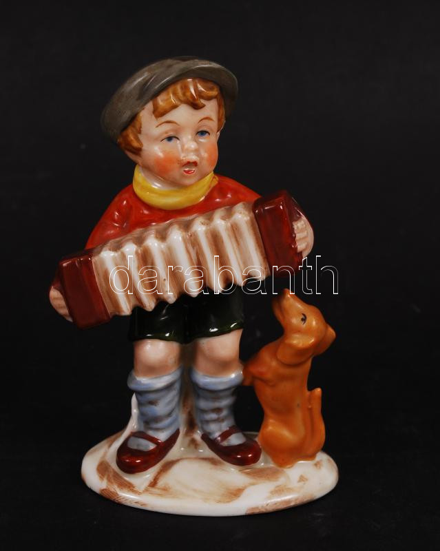 1 db W. A. Bertram zenélő fiú figura (kézzel festett, jelzett, kisebb lepattanással, 12 cm). 2 db sorszámozott német zenélő fiú figura (kézzel festett, apró lepattanásokkal, 11 cm, 11,5 cm)