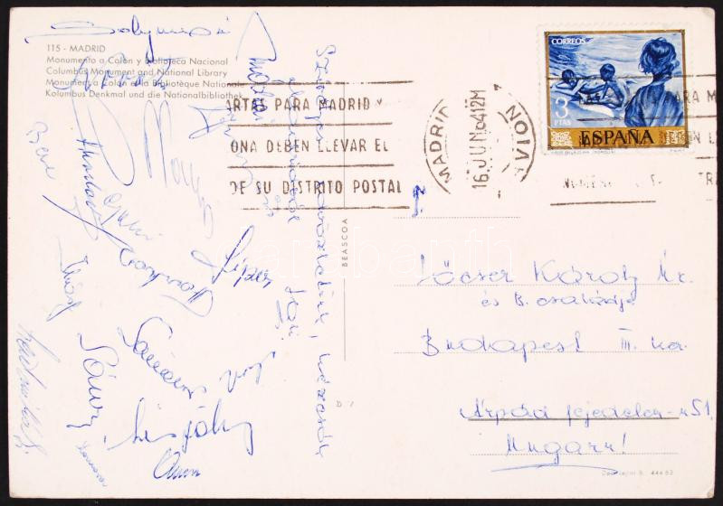 Beschreibung: cca 1960 A Madridban játszó magyar labdarúgó válogatott tagjai által aláírt képeslap