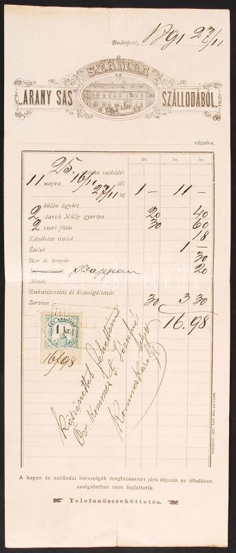 Beschreibung: 1891 Bp., "Arany Sas" Szálloda reklámos fejléces számlája