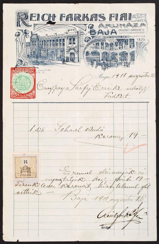 1911 Baja, Reich Farkas Fiai Áruháza reklámos fejléces számlája https://www.darabanth.com/de/208-Fernauktion/208.0/Andere-Sammelgebiete/Werbungen~30034/1911-Baja-Reich-Farkas-Fiai-Aruhaza-reklamos-fejleces-szamlaja~II847931