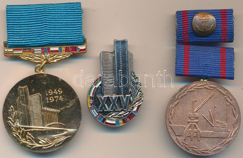 NDK 1974. "A KGST fennállásának 25. évfordulója" aranyozott emlékérem szalagon és fém jelvény + 1965. "Tengerészeti érdemérem" Br kitüntetés szalagon szalagsávval és miniatűrrel T:2