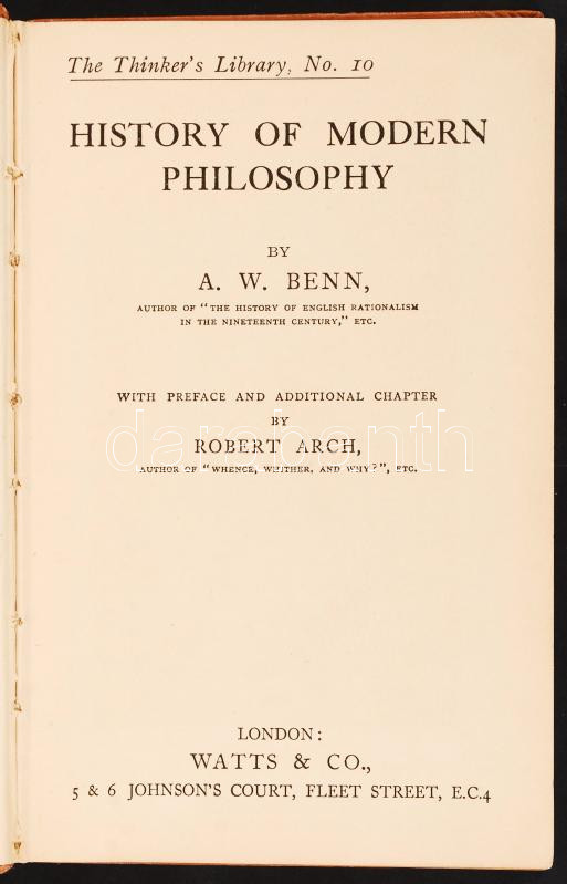 A.W. Benn: History of modern philosophy. London, 1930, Watts & Co. Kia... https://www.darabanth.com/de/209-Fernauktion/209.0/Andere-Sammelgebiete/Bucher-Andere-Sprachen~200373/AW-Benn-History-of-modern-philosophy-London-1930-Watts-Co-Kiadoi-kartonalt-kotes-gerin~II856160