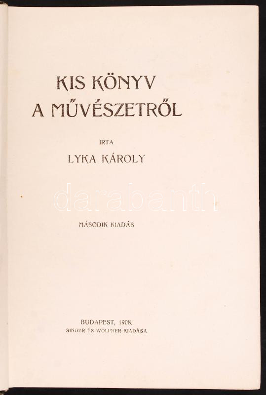 Lyka Károly: Kis könyv a művészetről. Bp., 1927, Singer és Wolfner. Ki... https://www.darabanth.com/de/209-Fernauktion/209.0/Andere-Sammelgebiete/Bucher-Architektur-Kunst~200368/Lyka-Karoly-Kis-konyv-a-muveszetrol-Bp-1927-Singer-es-Wolfner-Kiadoi-egeszvaszon-kot~II860835