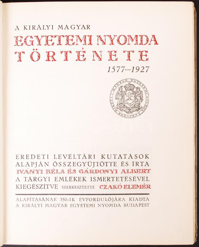 Iványi Béla-Gárdonyi Albert-Czakó Elemér: A Királyi Magyar Egyetemi Nyomda története 1577-1927. Czakó Elemér aláírásával. Bp., 1927, Királyi Magyar Egyetemi Nyomda. Kiadói félvászon kötés, kopottas állapotban.