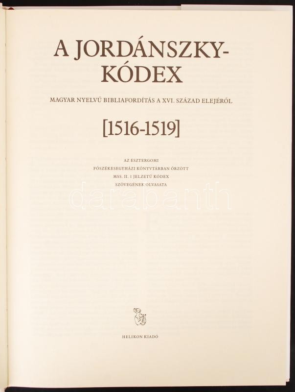 A Jordánszky-kódex, magyar nyelvű bibliafordítás a XVI. század elejéről/Csapodi Csaba: A Jordánszky-kódex/Utószó és szómagyarázatok a Jordánszky-kódex olvasatához Bp., 1984 Helikon. Egészbőr kötésben, eredeti tékában