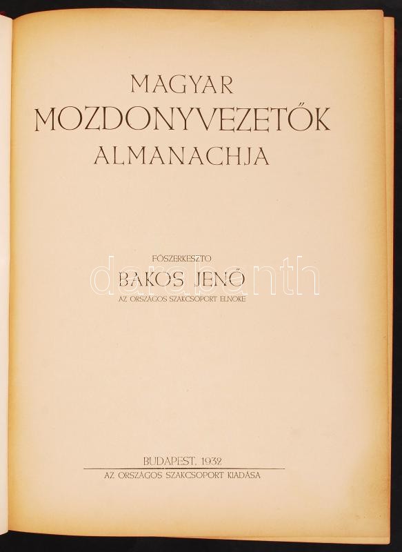 Bakos Jenő(szerk.): Magyar mozdonyvezetők almanachja. Bp., 1932, Országos Szakcsoport. Kiadói aranyozott egészvászon kötés, gerincnél és a sarkoknál enyhén szakadt, egyébként jó állapotban.