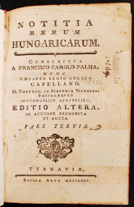 Notitia rerum Hungaricarum. Conscripta a Francisco Carolo Palma, nunc Caesareo Regio Aulico Capellano. SS. Theolog. in Academia Viennensi Baccalaureo Protonotario Apostolico, editio altera, ab auctore recognita et aucta. Pars tertia. Tyrnaviae, Recusa anno 1775. Újrakötött egészvászon kötés, színezett lapszélek, első lapja szakadt, molyrágta lapok.