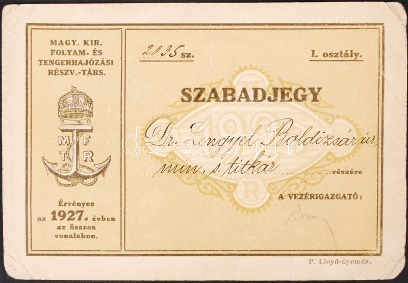 1928 Magyar. kir. folyam- és Tengerhajózási Rt. Hajózási Szabadjegy https://www.darabanth.com/de/209-Fernauktion/209.0/Andere-Sammelgebiete/Dokument~200358/1928-Magyar-kir-folyam-es-Tengerhajozasi-Rt-Hajozasi-Szabadjegy~II860666