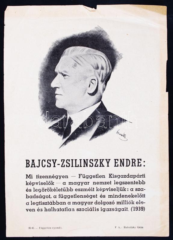Beschreibung: 1939 A Független Kisgazdapárt képviselői által megfogalmazott röplap Bajcsy-Zsilinszky Endre arcképével
