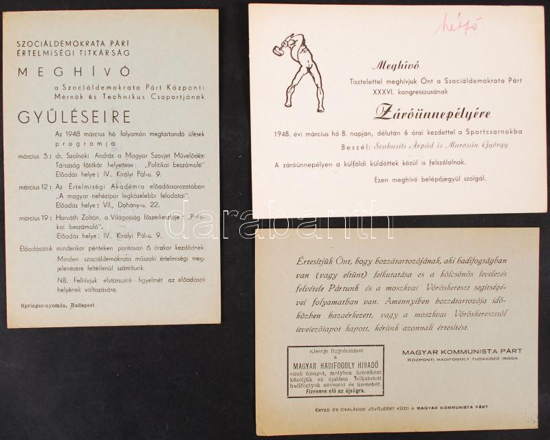 Beschreibung: 1946-1948 Magyar Szociáldemokrata Párt és a Magyar Kommunista Párt által kibocsátott meghívók, 3 db