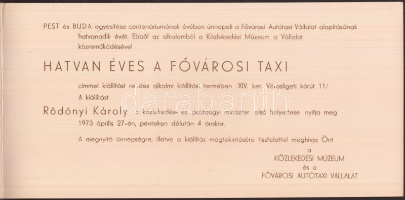1973 Bp., Hatvan éves a Fővárosi Autótaxi Vállalat meghívó https://www.darabanth.com/de/209-Fernauktion/209.0/Andere-Sammelgebiete/Drucksachen~600132/1973-Bp-Hatvan-eves-a-Fovarosi-Autotaxi-Vallalat-meghivo~II859647