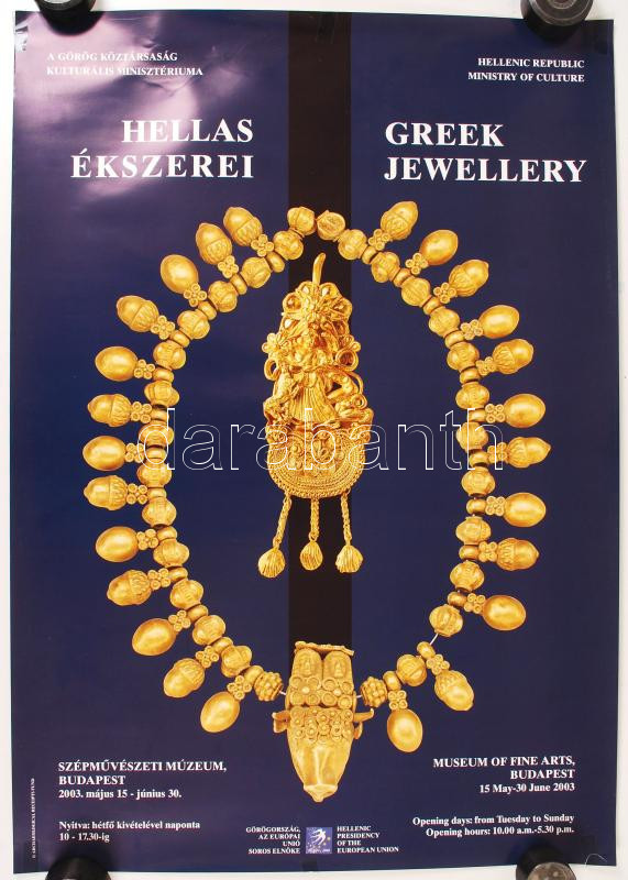 Beschreibung: 2003 Hellas ékszerei, görög kiállítás a Szépművészeti Múzeumban, magyar-angol nyelvű plakát, cellux maradványokkal, tekercsben, 68x48 cm