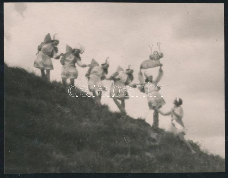 Beschreibung: 1930 Vajda: Júlia és a csoport, Szentpál Olga tánccsoportjának szabadtéri produkciója, feliratozva, a kép felületén homokszemcsék benyomódása, 10x13 cm