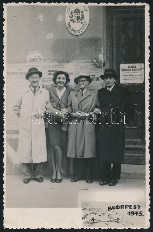 Beschreibung: 1945 Fekete György: Budapesti emlék az anyakönyvvezető hivatalának látogatása után, csipkés szélű fotólap, 9x14 cm