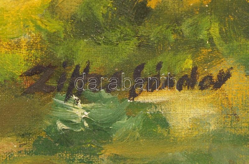 Beschreibung: Ziffer jelzéssel: Házsor az erdő végén. Olaj, vászon, jelzett, 50x50 cm