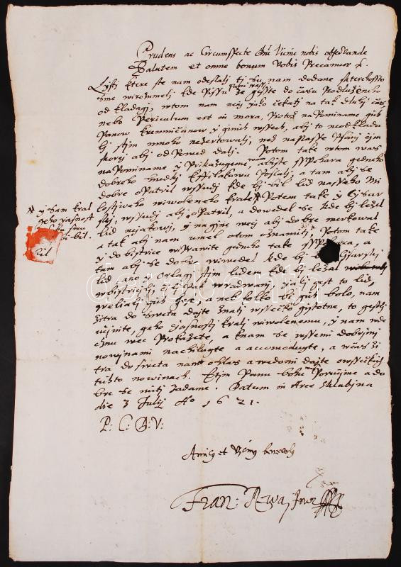 1621 Révay Ferenc nagybirtokos saját kézzel írt levele Szklabonyáról c... https://www.darabanth.com/de/209-Fernauktion/209.0/Andere-Sammelgebiete/Historische-Dokumenten-Handschriften~200360/1621-Revay-Ferenc-nagybirtokos-sajat-kezzel-irt-levele-Szklabonyarol-csaladi-viaszpecsettel~II860832