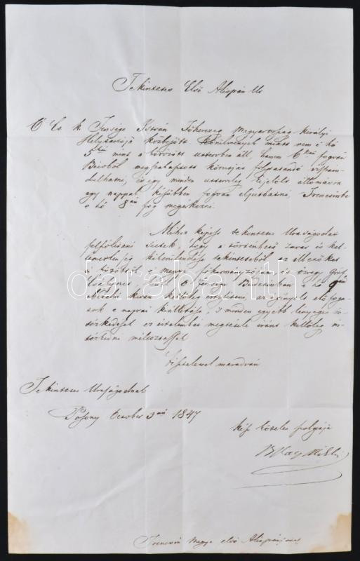 1847 Vajai Vay Miklós (1802-1894) báró, főispán, főrendiházi elnök, koronaőr, saját kézzel aláírt levele a trencséni alispánnak, melyben István nádor látogatását készíti elő. Viaszpecséttel