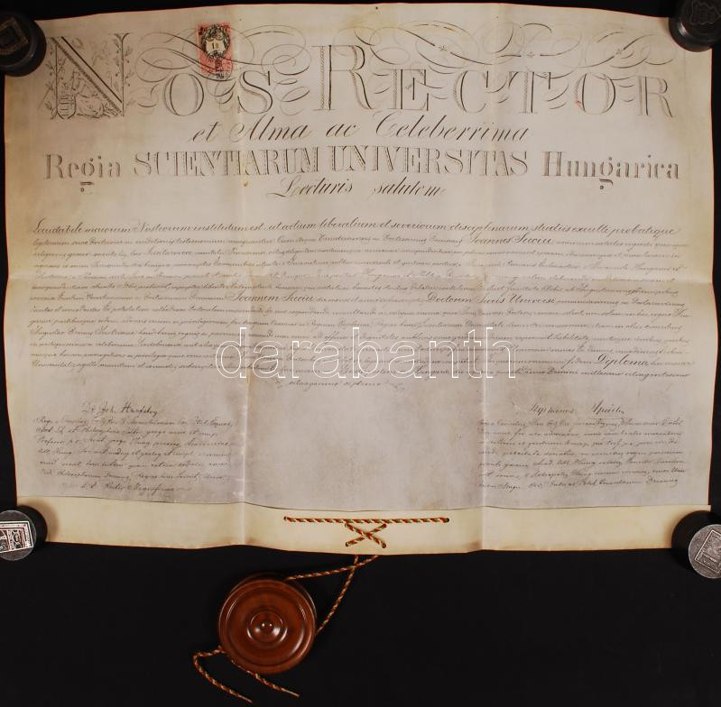 1887 Bp., A Budapesti Királyi Tudományos Egyetem által kiállított latin nyelvű jogi diploma függőpecséttel Hunfalvy János (1820-1888) földrajztudós aláírásával