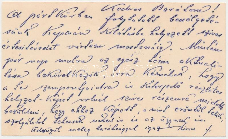 1917 Bp., Dr. Vadász Sándor újságíró, a "Politikai Híradó" kőnyomatos napilap szerkesztőjének saját kézzel írt üzenete barátjának