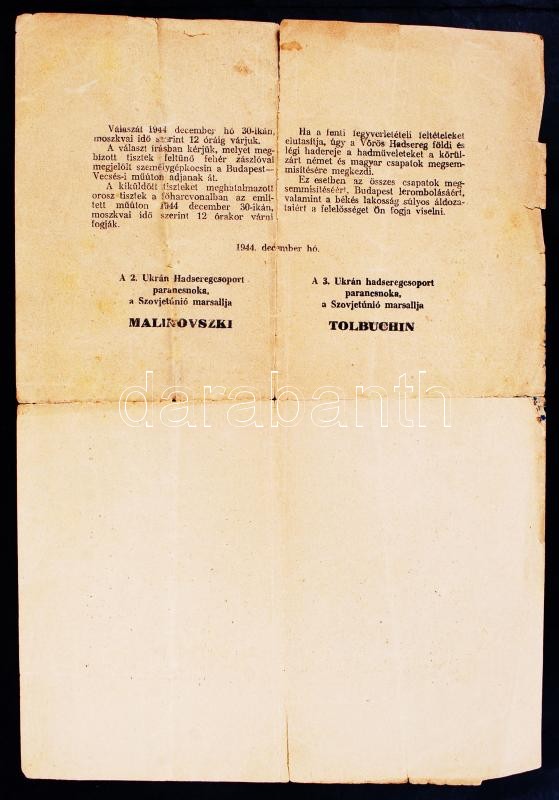 1944 Malinovszki és Tolbuchin hadseregparancsnokok által kiadott ultim... https://www.darabanth.com/de/209-Fernauktion/209.0/Andere-Sammelgebiete/Militaria~600130/1944-Malinovszki-es-Tolbuchin-hadseregparancsnokok-altal-kiadott-ultimatum-a-budapesti-nemet-es~II833385