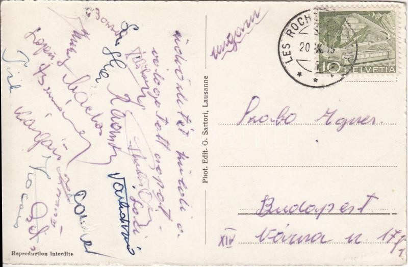 1955 A magyar Aranycsapat tagjai által aláírt és hazaküldött képeslap Svájcból a Magyarország-Svájc labdarúgó mérkőzés után (5:4) a képeslapon többek között Puskás, Bozsik, Buzánszky, Kárpáti, Sebes Gusztáv saját kezű aláírásával