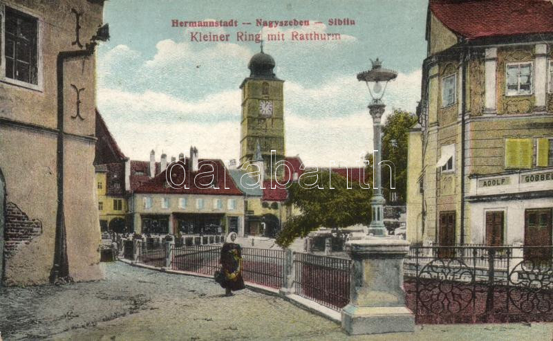 Beschreibung: Nagyszeben, Kleiner Ring mit Ratthurm, tér, Városi torony, Adolf Göbbel üzlete és kiadása / square, tower, shop (fl)