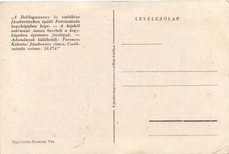 Jászberény, Porciunkula kegykápolna, reklám a hátoldalon (EK) https://www.darabanth.com/de/209-Fernauktion/209.0/Ansichtskarten/Ungarn~600005/Jaszbereny-Porciunkula-kegykapolna-reklam-a-hatoldalon-EK~II860269