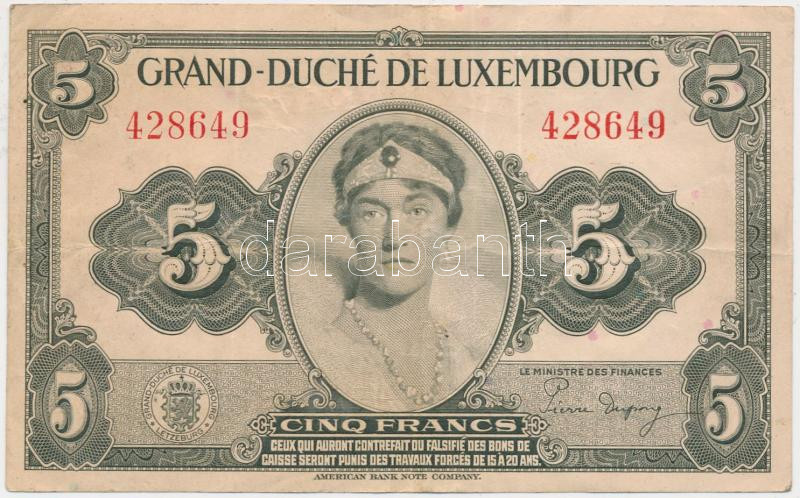 Luxembourg / Allied o... https://www.darabanth.com/de/209-Fernauktion/209.0/Numismatik/Weltweit-Banknoten~400012/Luxemburg-Szovetsege-megszallas-1940-5F-TIII-3Cbr3ELuxembourg-Allied-occupation-1940-5-Fra~II857667
