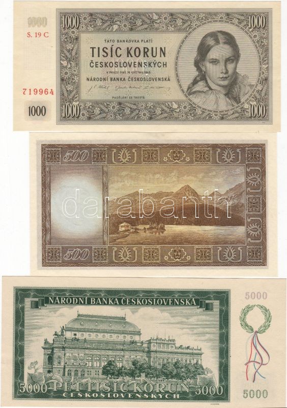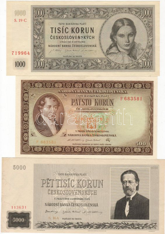 Csehszlovákia 1945-46 500K, 1000K, 5000K 3-as pont lyukasztással T:... https://www.darabanth.com/de/21-Fernauktion/21.0/Numismatik/~136/Csehszlovakia-1945-46-500K-1000K-5000K--3-as-pont-lyukasztassal-TI~II39242