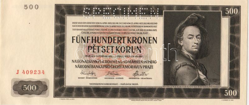 D.Reich/Cseh-Morva Protektorátus 1942 500K "Specimen" lyukasztás... https://www.darabanth.com/de/21-Fernauktion/21.0/Numismatik/~136/DReichCseh-Morva-Protektoratus-1942-500K----Specimen-lyukasztassal-TI~II39256
