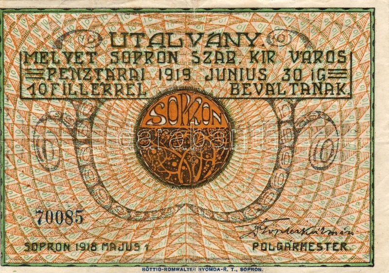 1919 Sopron 10f szükségpénz T:II https://www.darabanth.com/de/21-Fernauktion/21.0/Numismatik/~137/1919-Sopron-10f-szuksegpenz-TII~II39230