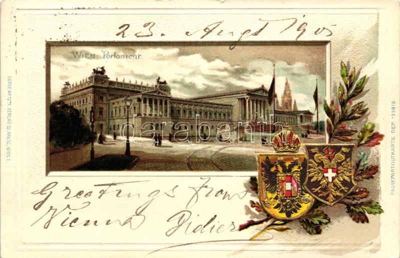 Beschreibung: Vienna, Wien, Parlament, Passepartoukarte, Wappen / Emb. coat of arms litho
