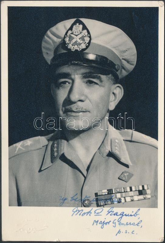 Signature of Muhammad Naguib (1901-1984), first president (1953-1954) of the Republic of Egypt, on his own photo, with practices of signature of László Budai (1928-1983) Hungarian footballer of the Golden Team on the back
